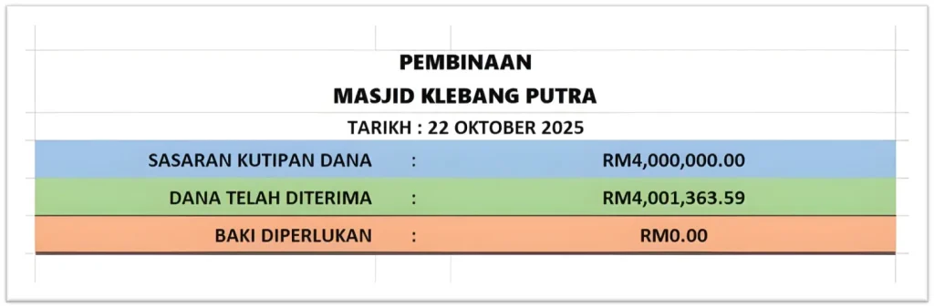 Alhamdulillāh… dengan penuh rasa syukur dan linangan air mata kegembiraan, kami mengumumkan bahawa kutipan dana pembinaan Masjid Klebang Putra kini secara rasminya ditutup.